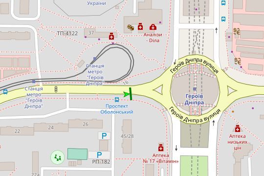Оболонський просп. - Героїв Дніпра вул., ;ст. метро "Героїв Дніпра" (у напрямку станції метро)