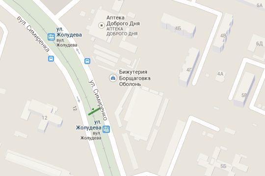 Симиренка вул., 2;100м до повороту на Жолудєва вул.; навпроти універсаму (у напрямку Михайловської Борщаговки)