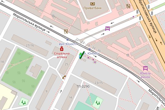 Миропільська вул., ринок "Юність" - Юності вул.